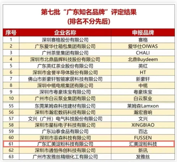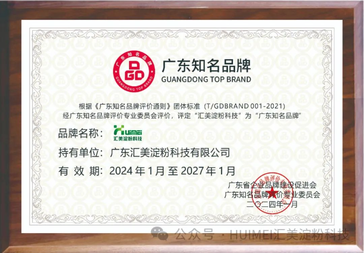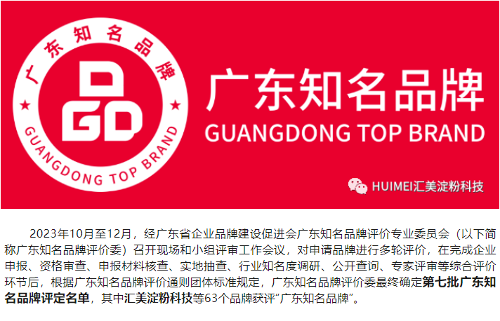 喜訊!匯美淀粉科技榮獲“廣東知名品牌”榮譽稱號