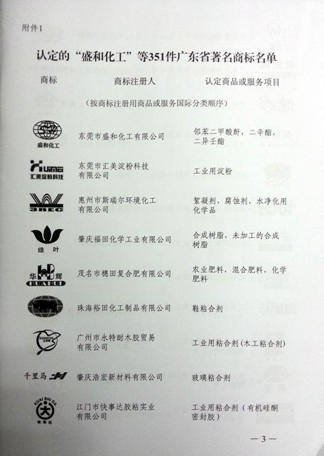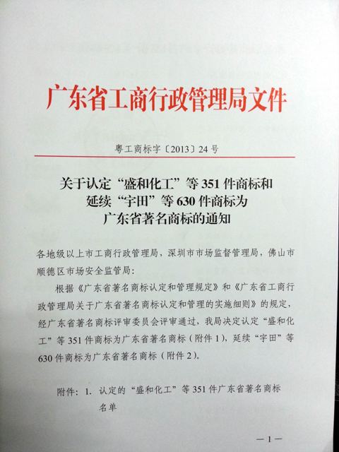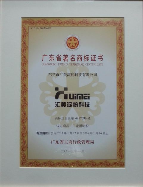 根據(jù)廣東省工商行政管理局文件(粵工商標字【2013】24號)“關于認定‘盛和化工’等351件商標和延續(xù)‘宇田’等630件商標為廣東省著名商標的通知”,我公司注冊商標 “匯美淀粉科技”被認定為“廣東省著名商標”,成為變性淀粉行業(yè)首家獲此殊榮的企業(yè)。