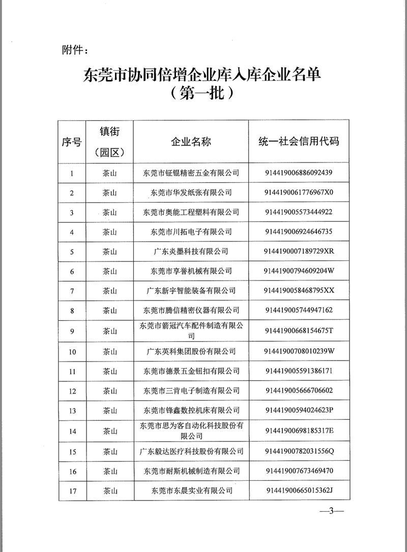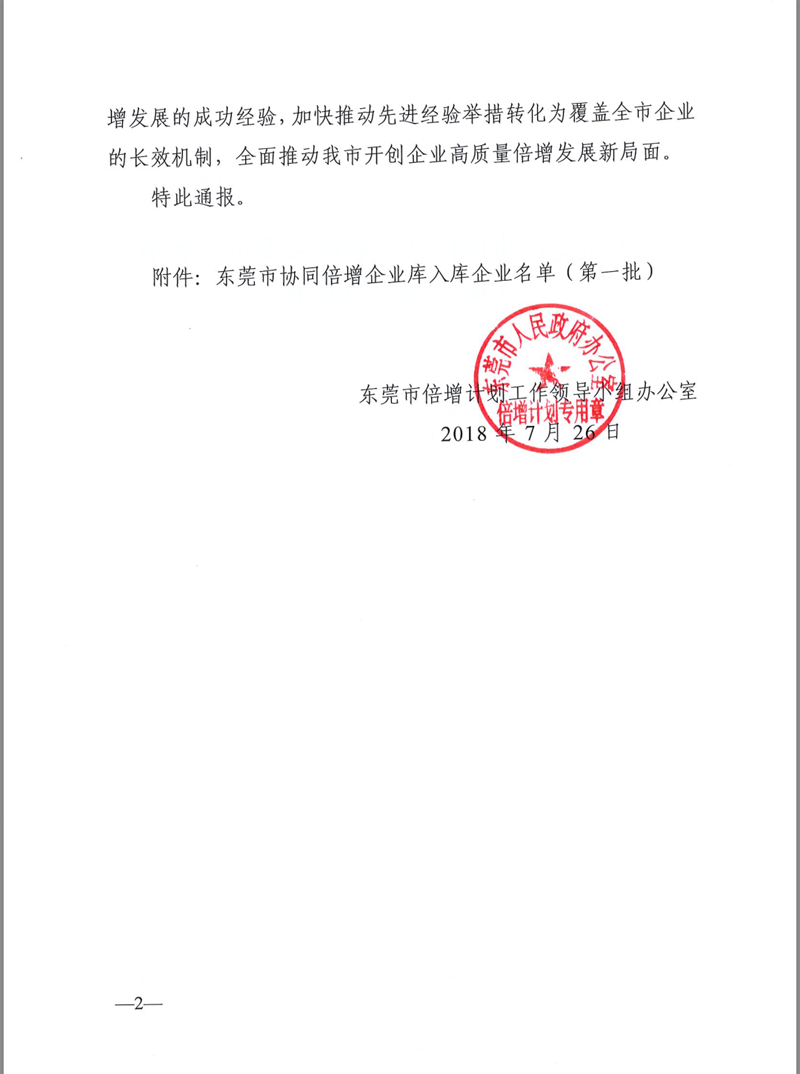 根據(jù)東莞市“倍增計(jì)劃”工作部署,經(jīng)組織申報(bào)、鎮(zhèn)街審核推薦、遴選委員會討論、市倍增辦工作會議審議、市政府審定等一系列流程,市倍增辦最終于2018年7月26日確認(rèn)東莞市協(xié)同倍增企業(yè)庫入庫企業(yè)名單。