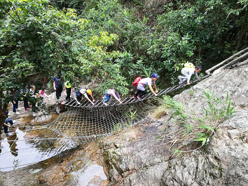 此行第二站是挑戰(zhàn)廣東最刺激的牛魚嘴玻璃橋。位于牛魚嘴國家森林公園的玻璃橋,橫跨了牛魚嘴大峽谷,全長兩百余米,遠遠望去,青山之間,玻璃吊橋猶如一條橫空出世的巨龍,橫跨其間,氣勢恢宏。尋著玻璃巨龍,我們朔溪而上,探險而行,一路上欣賞著古樹老藤、怪石林立,聆聽著流水潺潺,泉水叮咚,三三兩兩或駐足欣賞美景,或疾步匆匆向玻璃橋前行,短短半個鐘,便來到了云海玻璃橋。玻璃吊橋由鐵索和鋼化防滑玻璃鋪設(shè)而成,初初踏上玻璃橋,待我們小心翼翼龜速挪行時,耳畔卻不時傳來玻璃碎裂的聲音特效,頓時嚇得人腿軟,更有膽小的游客立即掉頭折返,而那些膽大的同事早已瞬移吊橋中間俯瞰山林欣賞美景,橋側(cè)山體垂直,橋下林木蔥郁,站在玻璃橋上仿佛置身于空中,飛索滑道、萬丈青山一覽無余,讓人驚嘆??邕^云海玻璃橋,下山的路更是令人期待,坐上近千米的玻璃飛龍滑道從山頂直撲下來,時而疾速下滑,時而彎轉(zhuǎn)慢行,刺激、歡樂、童趣貫穿其中,瞬間讓我們回到童年時代。