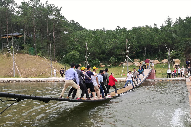 牛魚嘴風(fēng)景區(qū)內(nèi)湖光山色極為誘人,下山以后,同事們便集聚湖邊瞧一瞧2018紅遍全網(wǎng)的網(wǎng)紅搖搖橋——一座快樂且具有魔力的橋。“不搖不知道,一搖就會笑”,看著一陣陣歡笑傳來,同事們也忍不住上橋躍躍欲試,搖擺、對陣、歡笑、落水......在這座橋上,不分年齡性別、不論身份地位,只要上橋就丟掉了一切束縛并自動解鎖,聚焦歡樂一起搖擺!