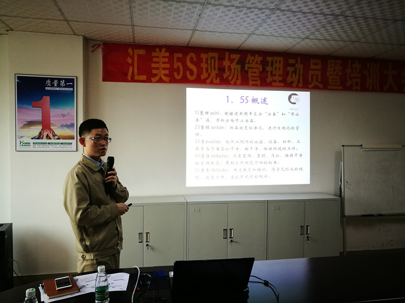 結(jié)合喻總對5S現(xiàn)場管理的動員要求,生產(chǎn)部經(jīng)理黃洪主講生產(chǎn)現(xiàn)場5S管理培訓(xùn),使與會人員對5S管理有了較為全面的了解。黃經(jīng)理以大量的圖片為出發(fā)點,具體的介紹了5S的概念、5S在企業(yè)管理中發(fā)揮的積極作用以及如何推動5S管理的執(zhí)行。隨后黃經(jīng)理詳盡介紹了5S管理常用的實施方法及5S活動程序中應(yīng)該注意的要點,通過分享大量5S管理的實施圖片,指出我們生產(chǎn)現(xiàn)場及辦公區(qū)需改善之處,讓參會人員對5S管理的推動有了更為直觀的理解,為匯美5S管理的推行,完善公司5S管理提供了理論知識和實施方向。